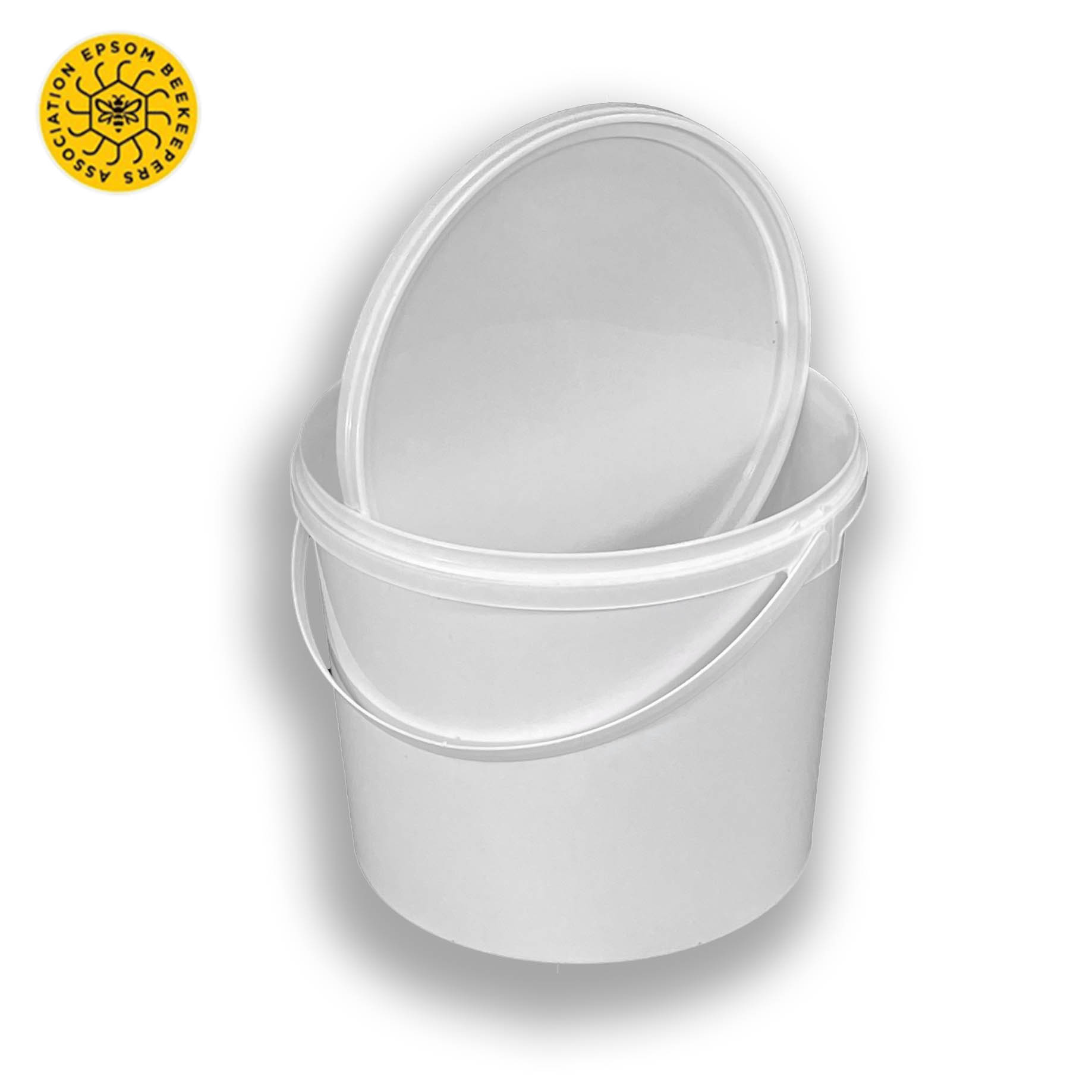 White food grade plastic bucket and lid with plastic handle.